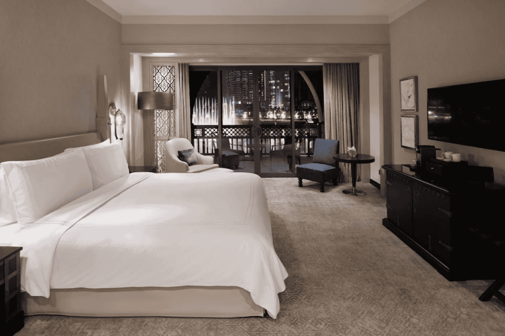 Set beside the Burj Lake, this Arabian-inspired resort fuses old-world charm with contemporary luxury. Surrounded by palm-lined walkways and shimmering water views, guests can dine al fresco at Asado or enjoy evening fountain shows from their private balcony. The serene spa and central location make it ideal for romantic getaways and cultural explorers alike.