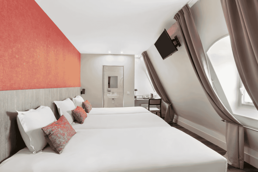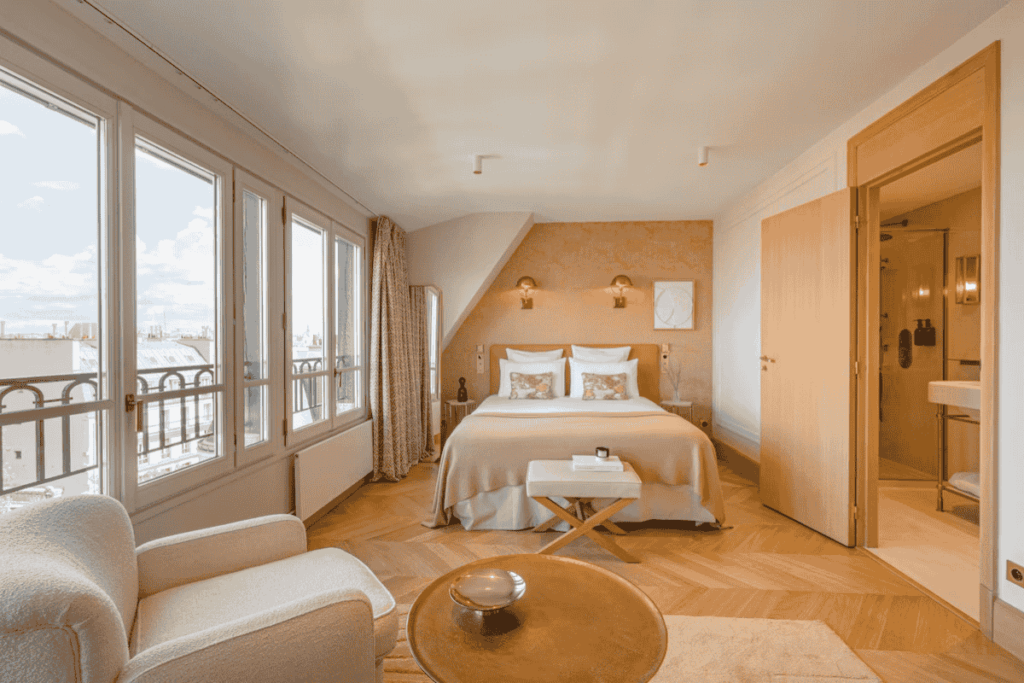 Set opposite Saint-Germain-des-Prés Church, Hotel Madison is a Left Bank favourite for those who love being close to cafés, bookshops, and the Seine. Guests can walk to the Louvre, Luxembourg Gardens, or Musée d’Orsay in minutes, then return to elegant rooms filled with warm tones and natural light. It’s a peaceful yet central base for exploring cultural Paris.